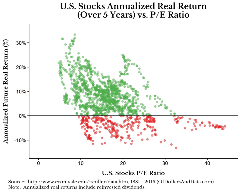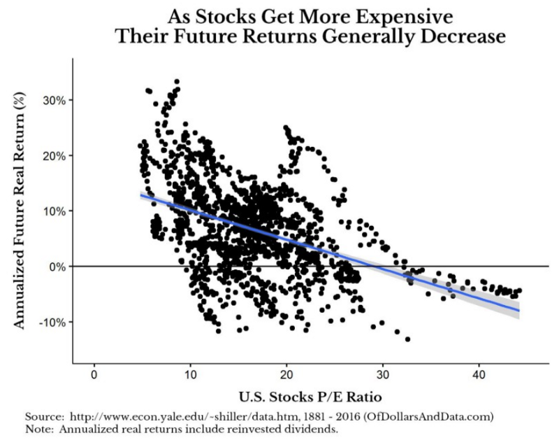 在下圖,X軸顯示美國股市的歷史P/E ratio,Y軸則是未來的報酬率。