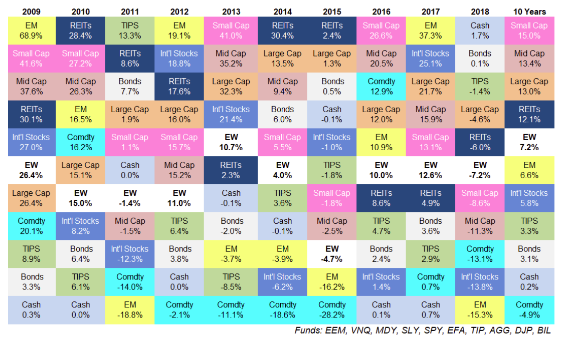 你將會看到EW所在的位置,不管在什麼時期,他不會是最頂尖的報酬,也不會是最差的報酬。保持在一個低波動的變化,這種情況很適合一般大眾投資者,原因在於它可以避免你的情緒起伏而且可以給你不差的報酬,降低了單一持有的風險。而如果你是屬於即將或是退休的成員,那麼這種低波動的組合再適合你不過了。