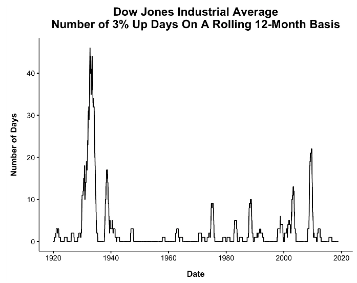 讓我們來看看道瓊指數一年之中上漲3%的天數是如何分布的