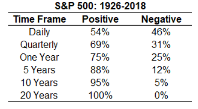 在各種不同的時間維度下,從下方的表格可以看出投資週期越長,出現正報酬的機率越大。而一天的勝率如同翻硬幣一般,但是如果把時間週期拉到二十年,則是百分百的勝率。