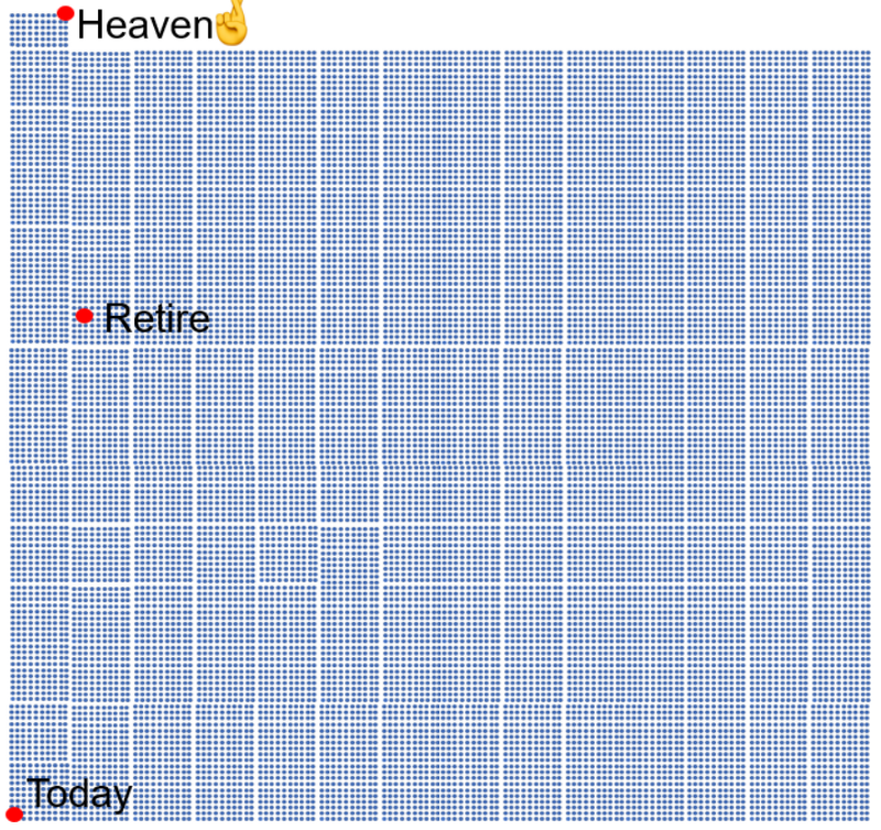 假設一位30歲的年輕人正在規劃35年後的計畫(65歲退休),而估計在80歲的時候去世,圖中每個藍點代表的是一天。