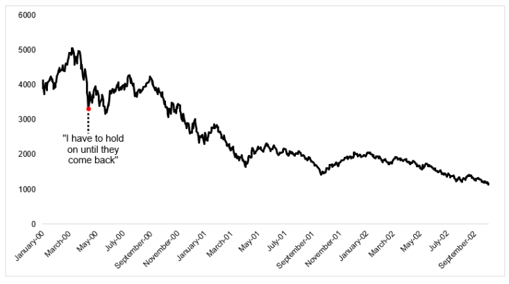 而科技股在隔周一,很給面子的上漲了6.6%,週二上漲7.2%,投資人鬆了一口氣,但是,這種反彈是短暫的。在接下來的兩年半時間,Nasdaq 指數再次下跌超過三分之二。也就是你投資一百萬只剩下33萬,你覺得那些投資人可以繼續承受虧損不賣出嗎?