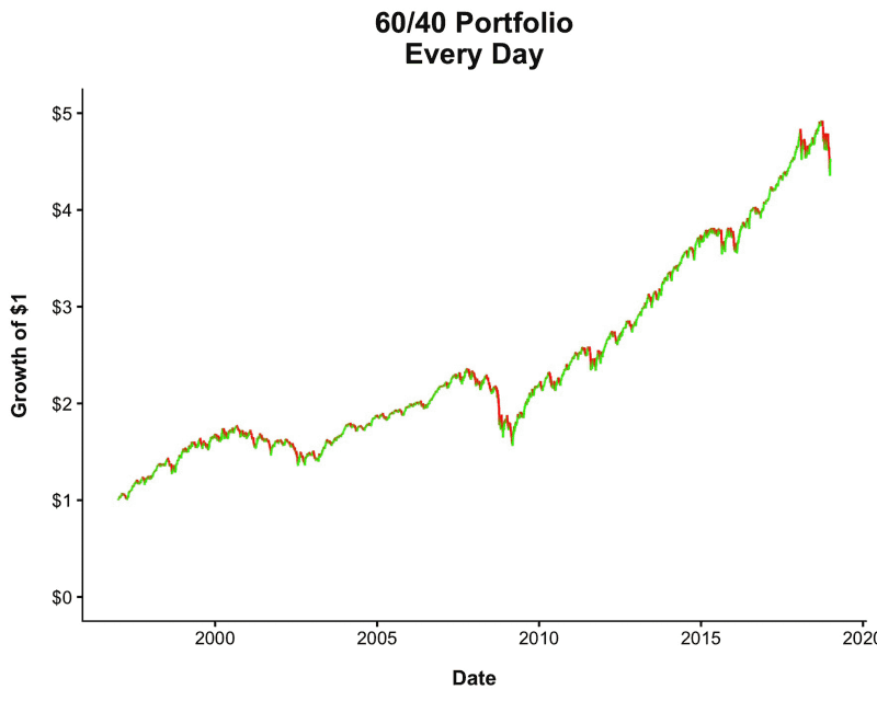 假使我們有個60/40的股債組合,你可以從下圖的動畫中看到,在不同的時間週期查看績效的結果,遭遇虧損(紅線)情況的不同。