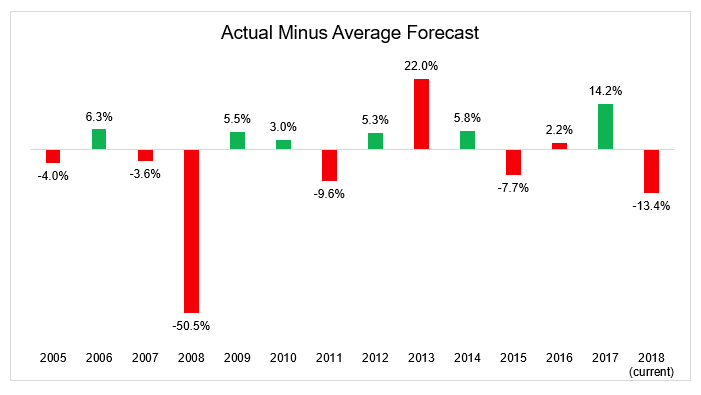 綜觀從2005年開始的專家預測,在153次的預測中,僅有6次是負的預測。平均來說是9%的漲幅。這是很合理的,因為綜觀過去50的歷史,股票有72%的時間是上漲的。