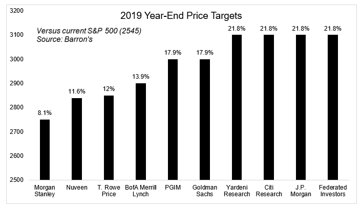 - 2019年S&P500預測的平均指數是2974,將近是17%的漲幅