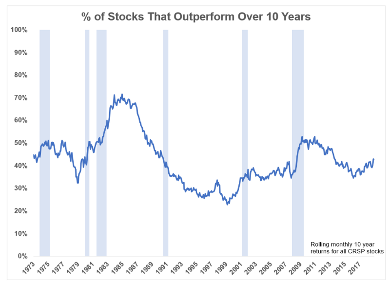 我們再來看南卡羅來納大學的教授Ozgur所做的一項研究數據,其內容是從1973年來,持有個股10年的報酬優於標普500指數的比例。