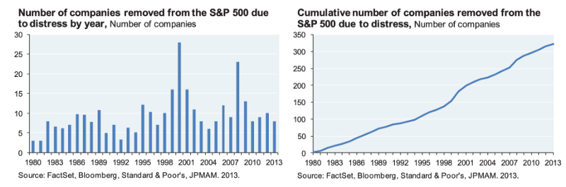 我們轉頭看看標普500,代表美國前市值500的公司。從1980年,已經超過320家的公司從該指數中剔除。