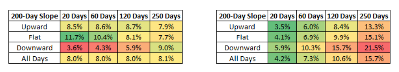 平均來說,當一個下降的200天均線,短期內的回報很差,而且波動性往往都是最高的;然而,一年後的報酬卻是最高!!