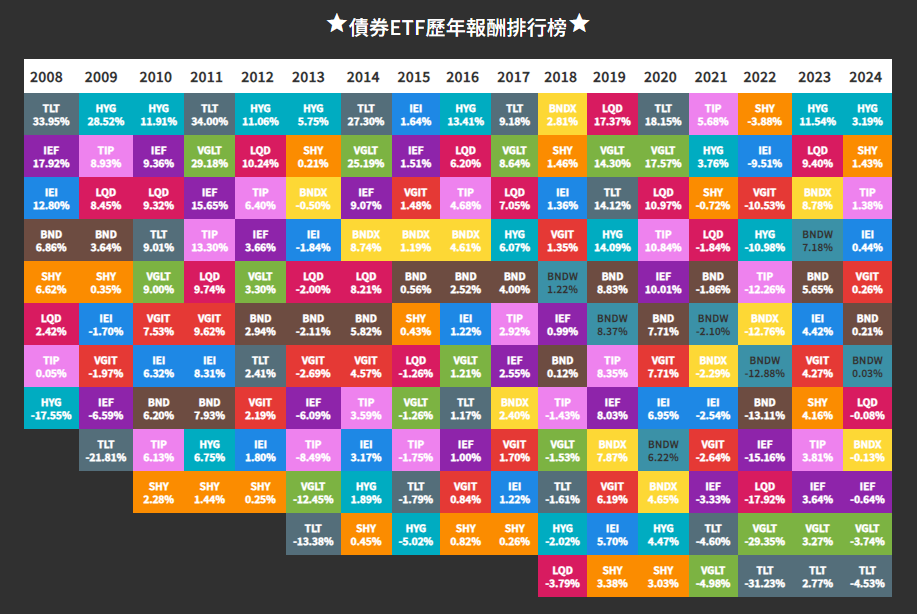 排行榜的數據呈現,一開始只有MSCI國家的年度比較表,現在我們新增了美股債券ETF以及美股產業ETF的年度排名。