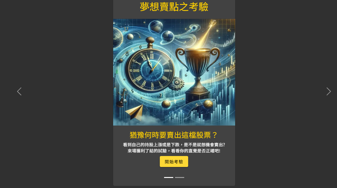 接下來則是關於交易試煉場,這個部份我主要想要透過兩個簡單的遊戲,模擬過去股市的走勢,讓使用者理解決定賣出時機、以及擇股的難度是非常高的。