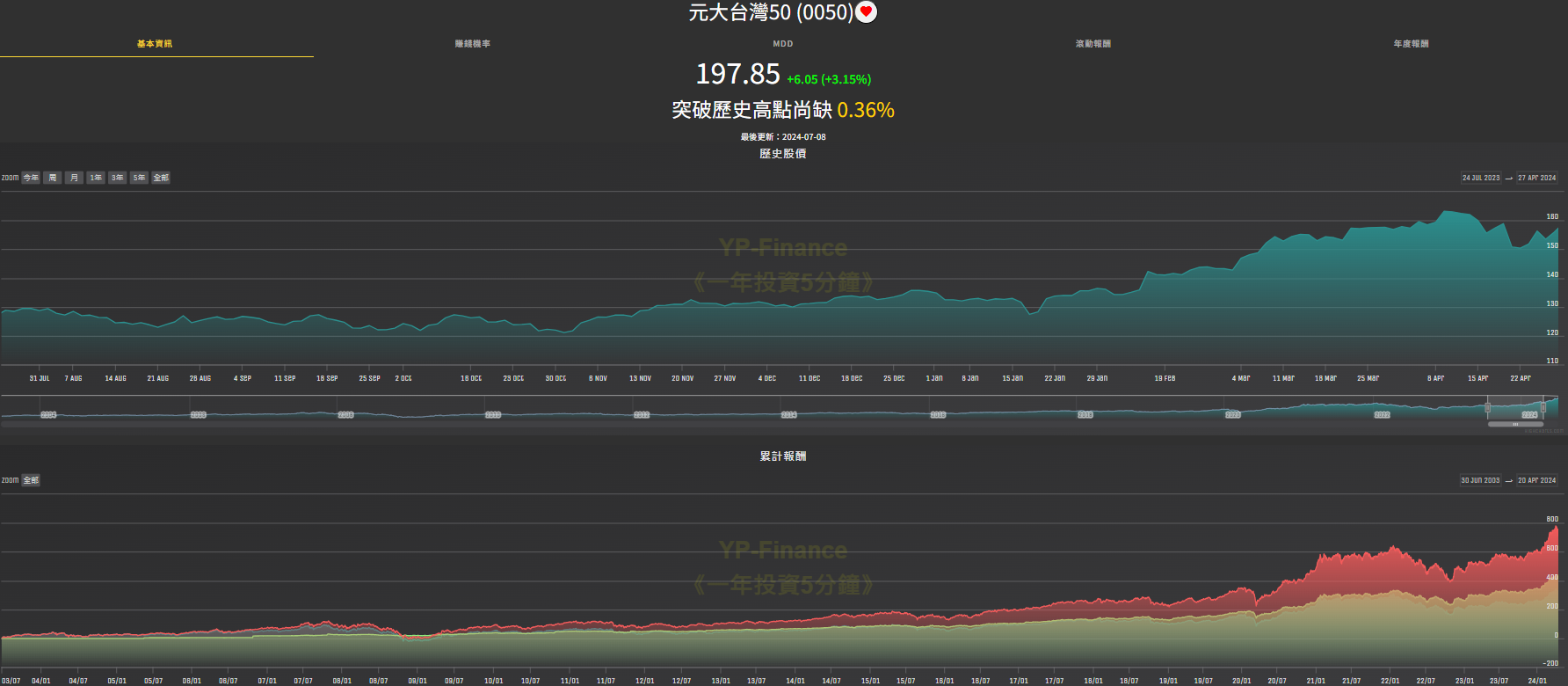 現在的台股資料庫不僅只支援台股上市標的與ETF,近期我們也將上櫃的個股ETF資訊一併加入,並在基本資訊頁面修改更好的UI設計,像是更明顯的股價呈現,還有股息帶來的累積報酬差異。