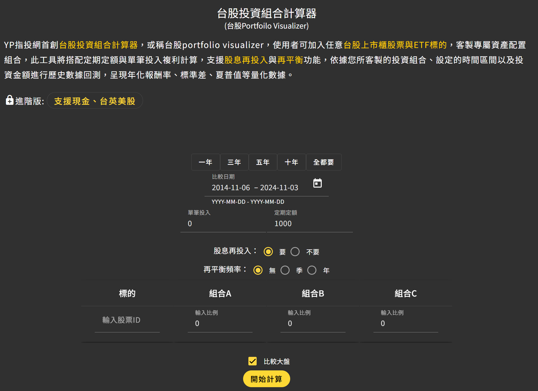 如果你是採用資產配置的方式,也能透過台股投資組合計算器(台股Portfoilo Visualizer),勾選比較大盤的選項,來進行”跑贏市場”的驗證。