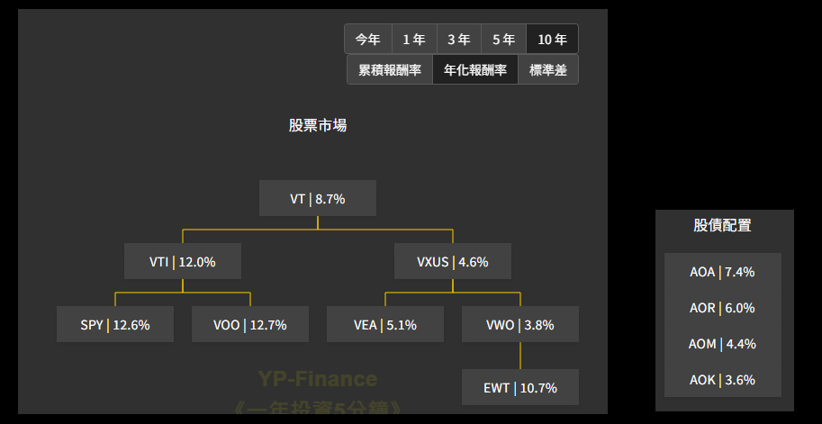 對比剛剛所計算出來的台灣房地產4.5%,僅勝出新興市場以及股債配置的AOM與AOK。