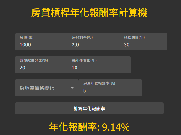 - 房屋價值的變化有兩種方式,年化報酬率或者是直接輸入賣出的價值