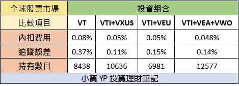 就成本、追蹤誤差以及分散式來說,VTI+VEA+VWO是比較有優勢的。但是缺點是購買的標的會上升到三個,投資人需要自行執行再平衡的機制。不過就方便性來說,VT是最有優勢的,簡單一個標的且內建自動再平衡,會是許多指數化投資人的選擇。儘管如此,不管選擇哪一種組合,我認為都是很不錯的資產配置,因為投資人願意捨棄擇地區改成投入大範圍的市場,本身就是一件很值得驕傲的事情。